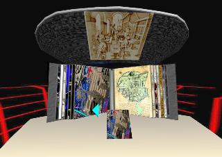 I enter the Cave, put on the glasses, pick up the wand and the 3D architectonic structure of the MultiMegaBook rises up in front of me occupying my entire field of vision. I am free to manipulate the MMB. I zoom it in and out, walk around it, see it from the back, from the front, make it smaller or as big as I wish. The touch screen is composed of two arrows (one left and one right) placed in front of the MMB and hanging in space ... clicking on it, I can move the pages, righ/left ... meanwhile images and objects, flying from the far emptyness slip into the BOOK.