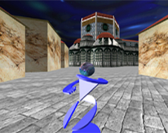 A stone grey floor emerges beneath my feet, the street seems endless. It leads from one corner to another, through passageways and porticos, from building to building. The buildings are real size, with fine details and meticulous facades. Their slight sepia colour contrasts with the intense blue of the mediterrean sky. The richly ornamented environment, together with the 3D music and the